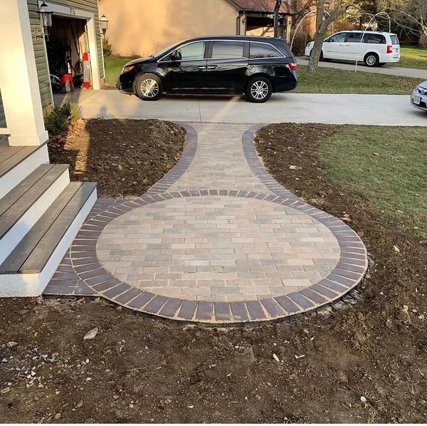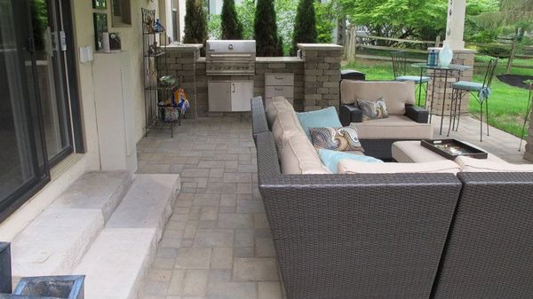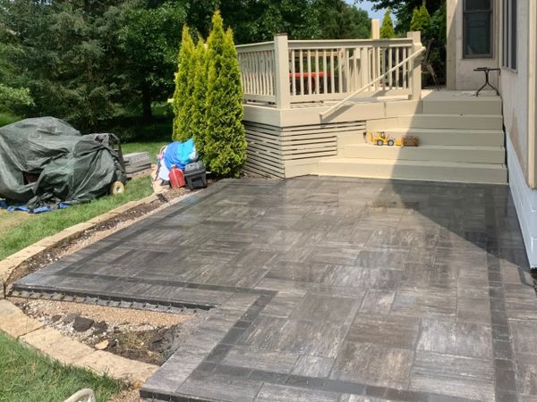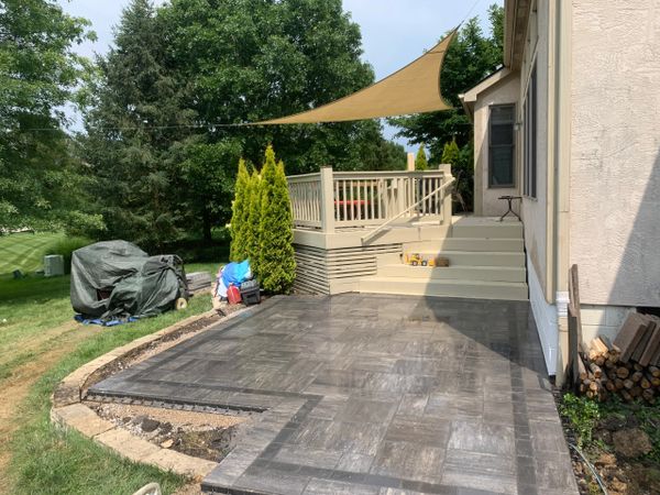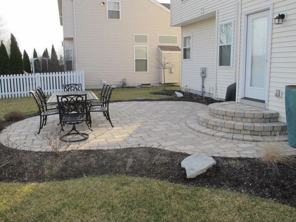 Transformed small concrete pad of this Delaware home into a spacious 800 sq. ft entertaining area with dining, firepit and walkway to welcome guests.