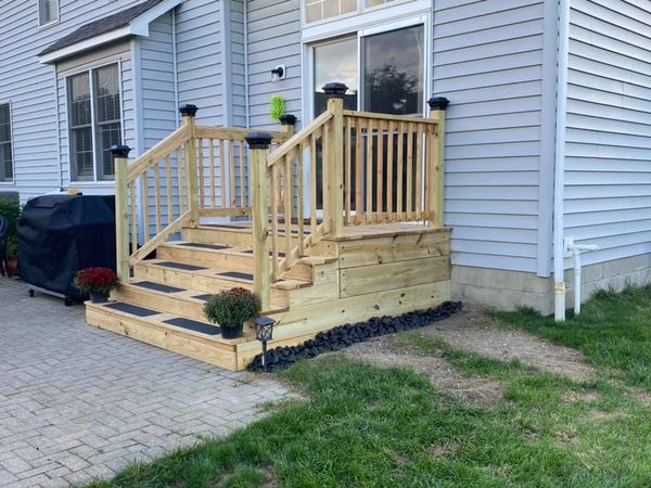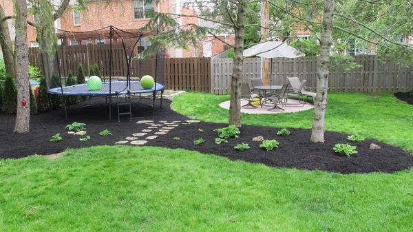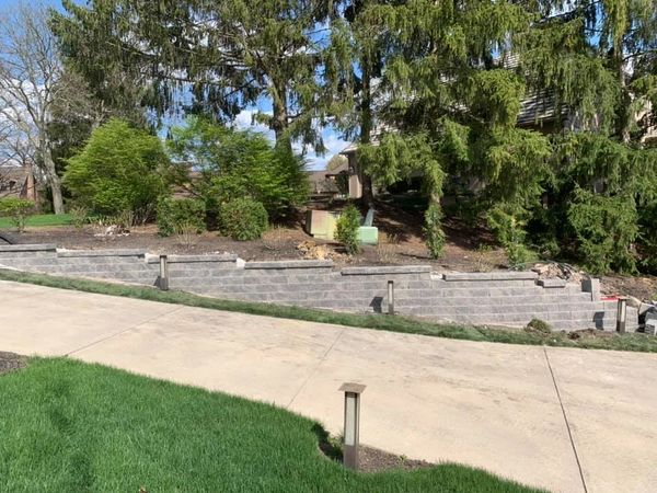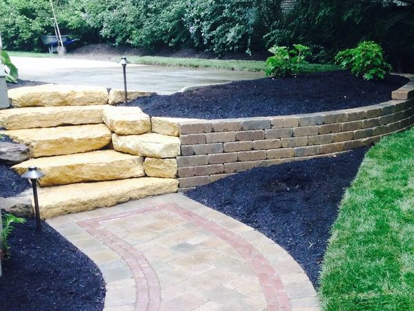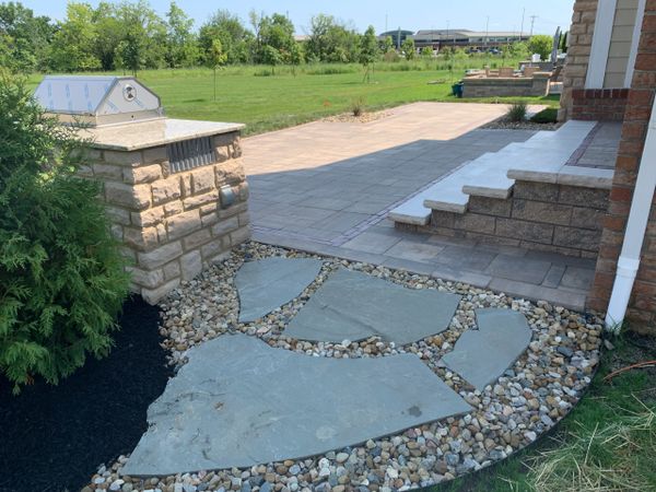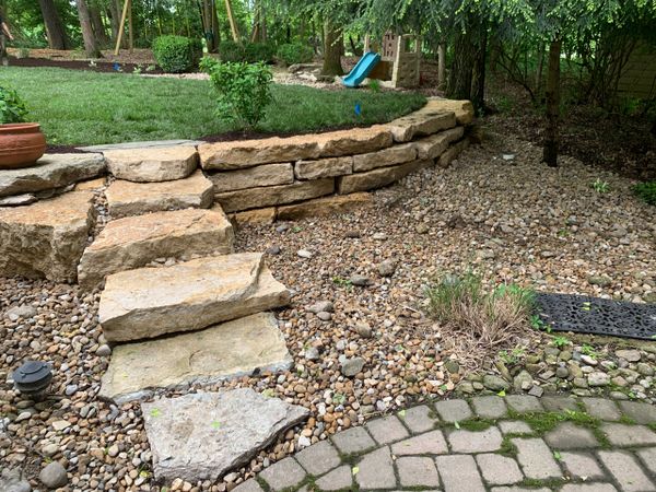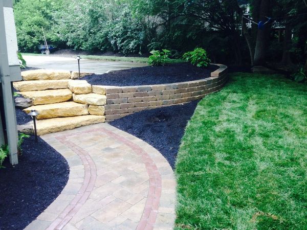 A Delaware Buff stone staircase offers a welcoming feel for this Worthington backyard. To compliment, retaining wall mulch beds & walkway were added.