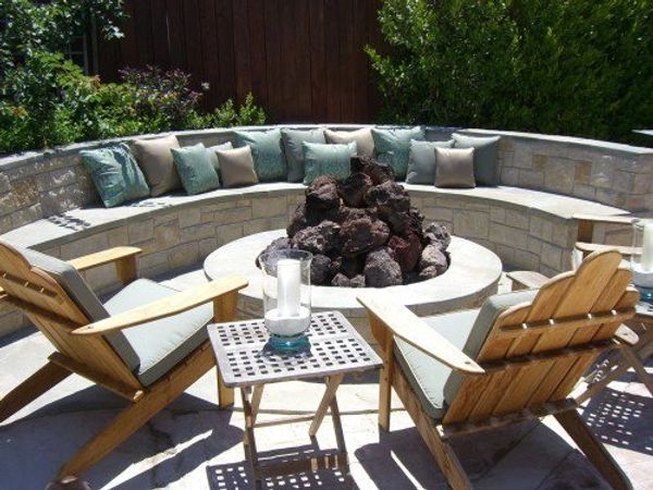 This lava rock gas firepit installation offers plenty of seating with the retaining wall bench and space for three Adirondack chairs.